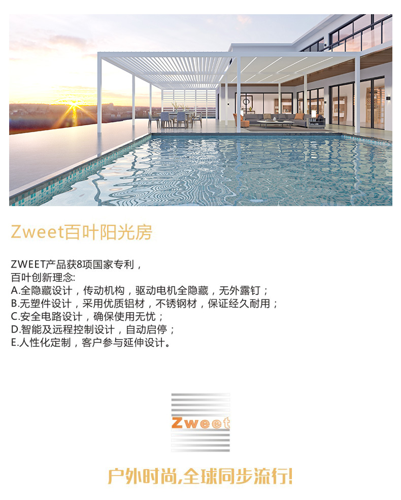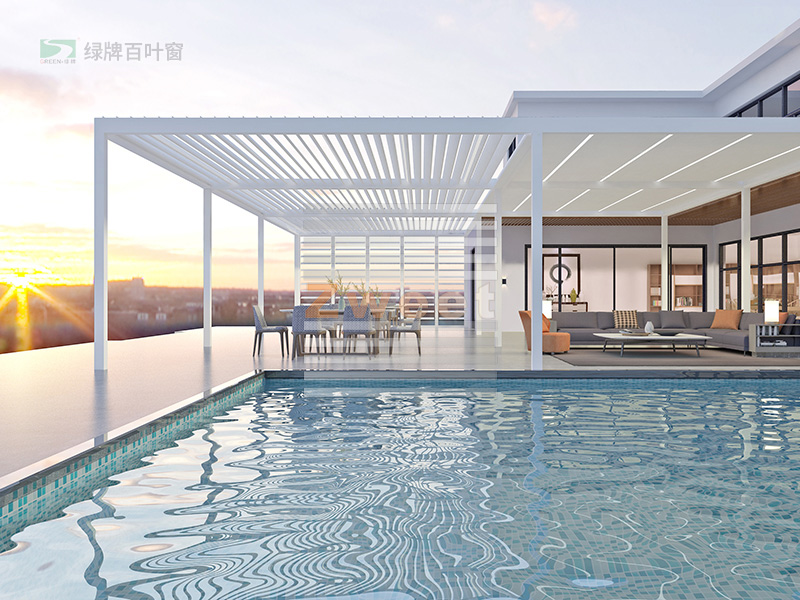 綠牌頂面遮陽防雨百葉房系統(tǒng)設計簡潔典雅,有多種顏色可供自由選擇,可與各種建筑風格相協調,不論是當代風格,現代風格,亦或是古典風格;不論是中國風格,或是歐美風格。