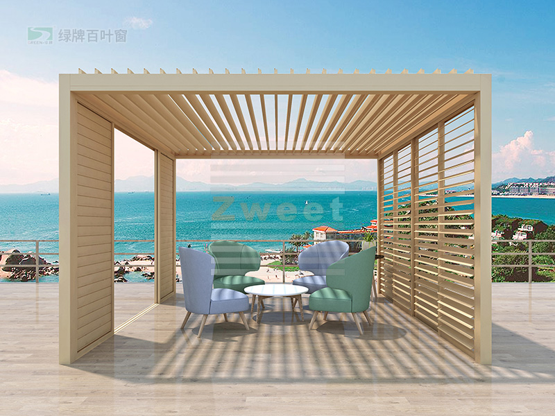 綠牌頂面遮陽(yáng)防雨百葉系統(tǒng)用于露臺(tái)遮陽(yáng),設(shè)計(jì)簡(jiǎn)約,美觀實(shí)用,通過(guò)調(diào)節(jié)頂面的百葉系統(tǒng),起到很好的遮陽(yáng)防雨效果。